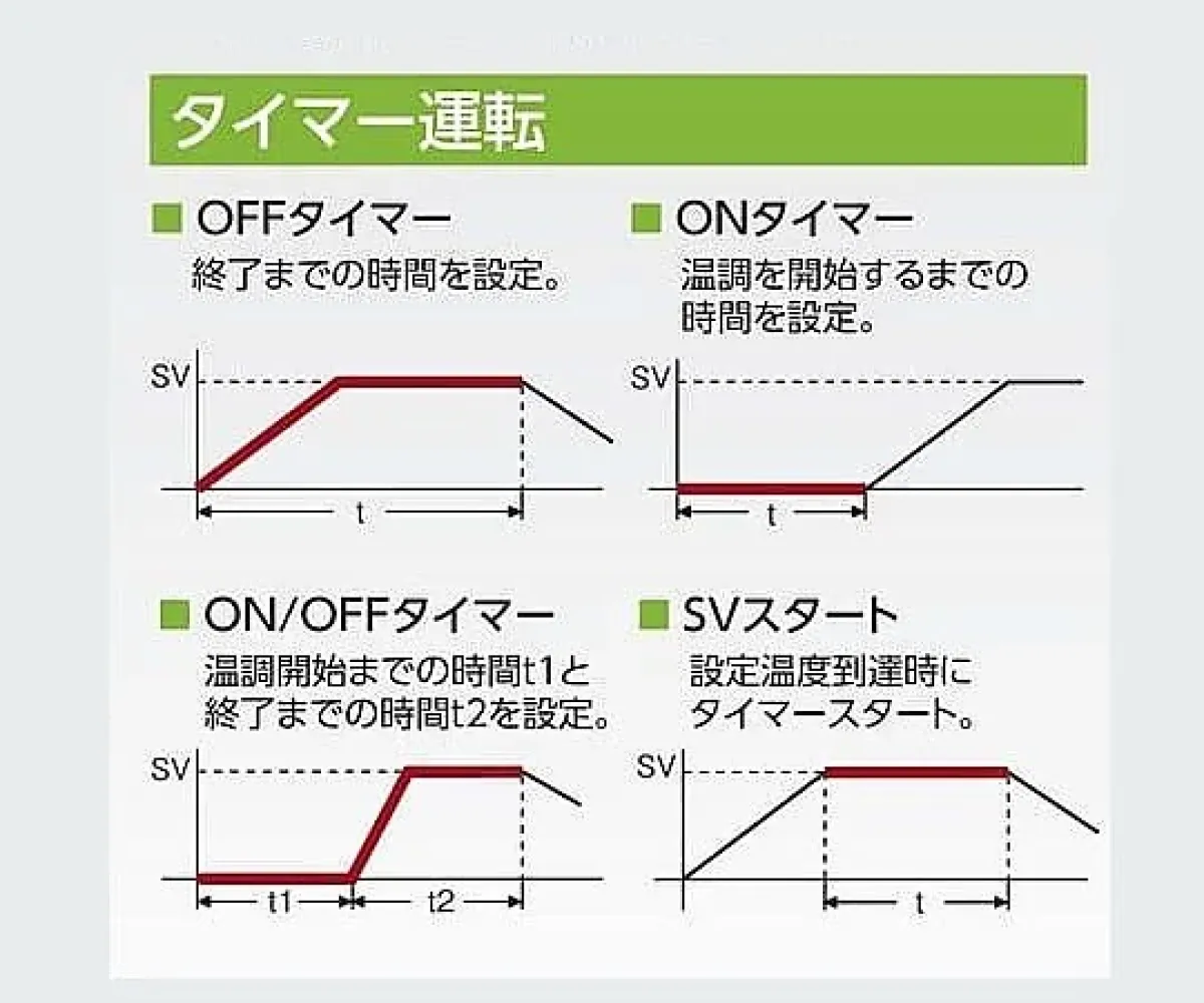 • Timers (4 types) and program operation (16 steps, 8 patterns) are standard equipment. In addition to temperature logging (Bluetooth communication), it has 100 VAC 1 A output in case of error.