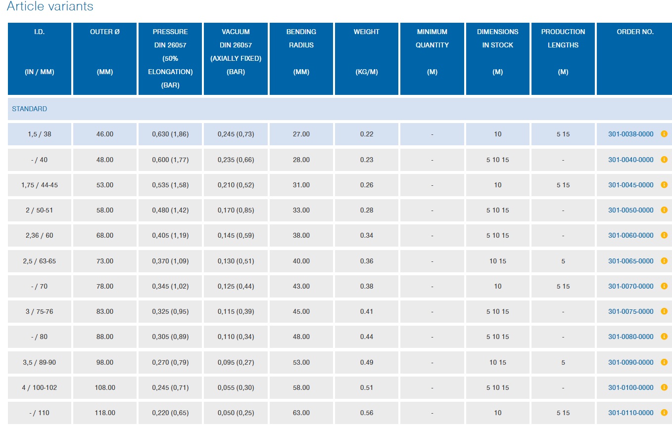 - Bán kính uốn cong: Tùy thuộc vào kích thước, ví dụ: với I.D. 2 inch (50-51 mm), bán kính là 1,30 inch.