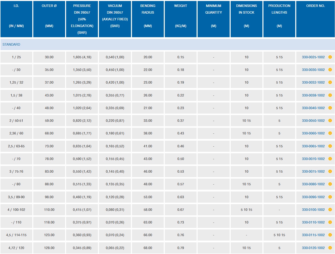 - Áp suất làm việc: Tùy thuộc vào kích thước, ví dụ: với I.D. 2 inch (50-51 mm), áp suất là 0,820 bar (2,12 PSI).
